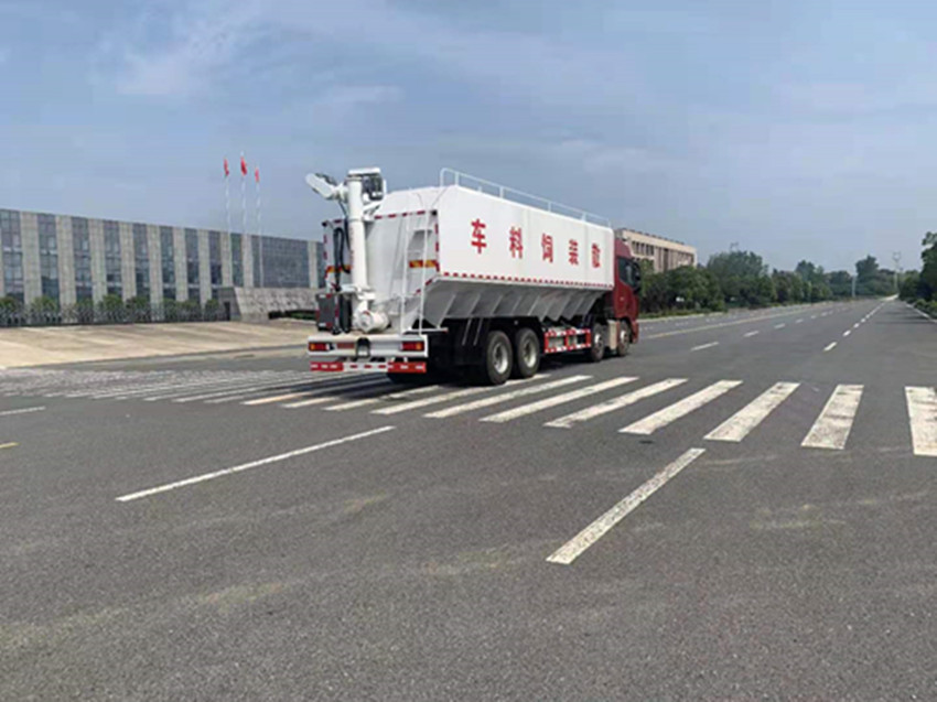 散裝飼料運(yùn)輸車,散裝飼料車的飼料罐架設(shè)在卡車的底盤上,罐頂開有進(jìn)料口.頂部的一根螺旋輸送卸料管(俗稱卸料絞龍)則可自由回轉(zhuǎn)和抬升,抬升的仰角可達(dá)60度。運(yùn)輸時(shí),頂部的螺旋管平臥在罐頂;卸料時(shí)則抬起,使管端的出料口與畜禽飼養(yǎng)場(chǎng)貯料罐頂部的進(jìn)料門相接,駕駛室內(nèi)裝有操縱裝置(操縱裝置也可裝置在罐體尾部),卸料時(shí)通過車底的動(dòng)力輸出軸和減速器來驅(qū)動(dòng)螺旋,以完成卸料。