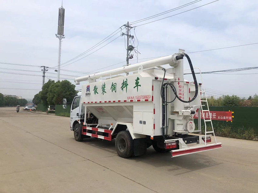 散裝飼料運輸車,散裝飼料車的飼料罐架設(shè)在卡車的底盤上,罐頂開有進料口.頂部的一根螺旋輸送卸料管(俗稱卸料絞龍)則可自由回轉(zhuǎn)和抬升,抬升的仰角可達60度。運輸時,頂部的螺旋管平臥在罐頂;卸料時則抬起,使管端的出料口與畜禽飼養(yǎng)場貯料罐頂部的進料門相接,駕駛室內(nèi)裝有操縱裝置(操縱裝置也可裝置在罐體尾部),卸料時通過車底的動力輸出軸和減速器來驅(qū)動螺旋,以完成卸料。